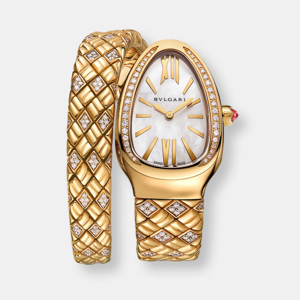 Associant l’audace de Serpenti et la légende de Spiga, signifiant « épi » en italien, la montre Serpenti Spiga mêle tradition et modernité. Contemporaine dans son design, purement romaine dans son symbolisme, cette montre s’enroule autour du poignet en évoquant une sensation d'infinité à travers son motif épi de blé abstrait, gravé dans le bracelet lui-même.